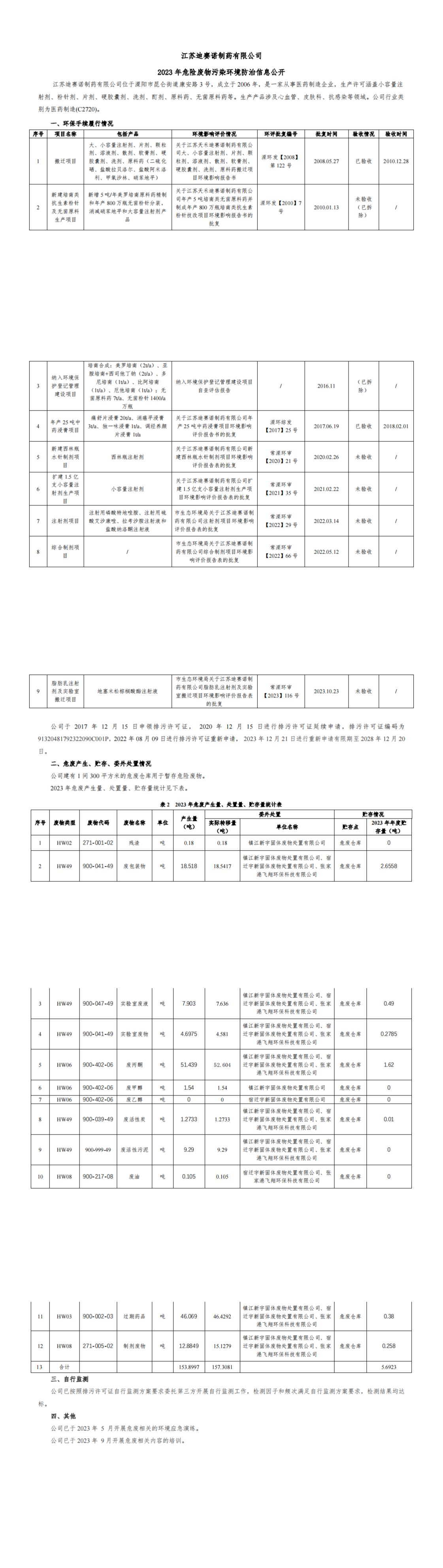 千亿·(中国)手机网页版 2023 年危险废物污染环境防治信息公开