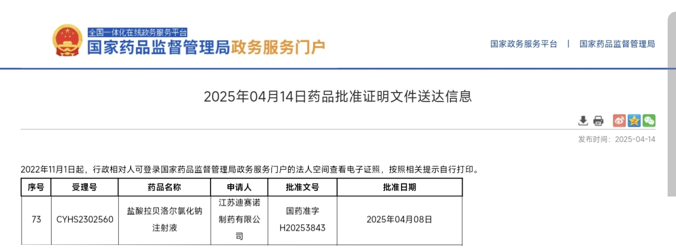 2025年4月8日,千亿·(中国)手机网页版的盐酸拉贝洛尔氯化钠注射液(国药准字H20253843)成功获得国家药品监督管理局(NMPA)批准上市,该产品是公司的化药3类仿制药,是该品种药物的国内首仿。这一成果标志着公司在心血管领域的产品布局迈上新台阶,也为广大患者提供了更优质的用药选择。